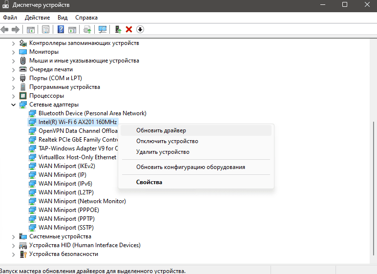 - Правой кнопкой мыши нажмите на адаптер и выберите "Обновить драйвер".