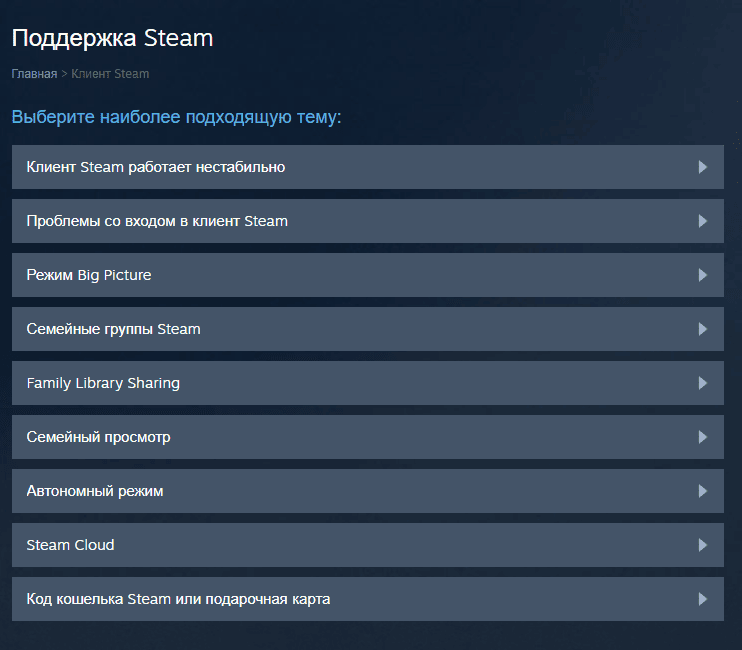 - Перейдите на страницу поддержки Steam.