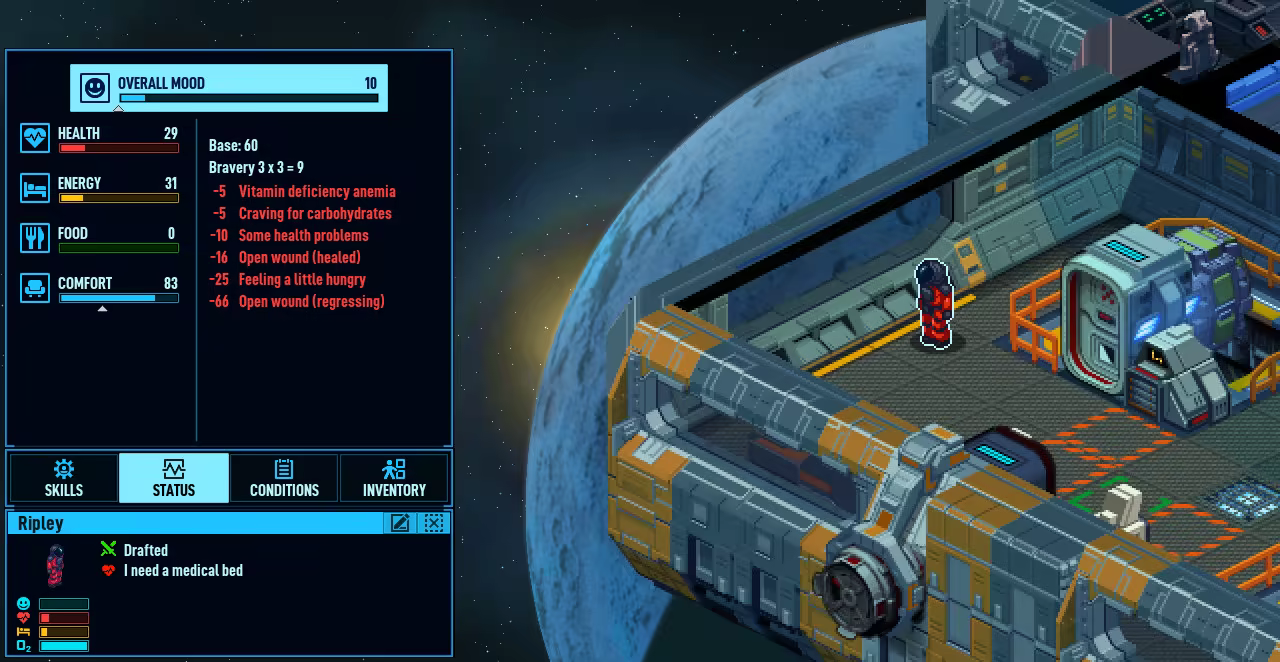 Условия: члены экипажа могут чувствовать тягу к приключениям, страдать от голода и проблем с гигиеной или просто переесть. Различные условия влияют на их самочувствие.