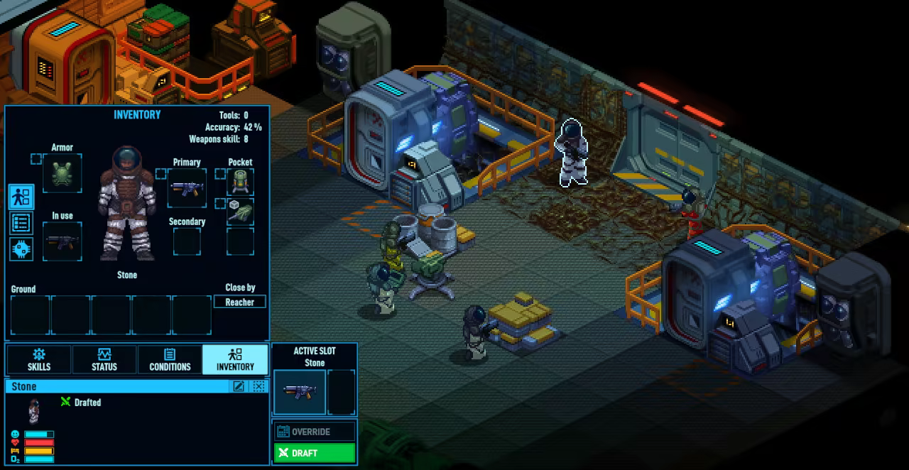 Навыки и черты характера: каждый член команды обладает рядом навыков и особенностей. Слабак может побояться выстрелить, а человек с железным желудком переварит что угодно без каких-либо последствий.