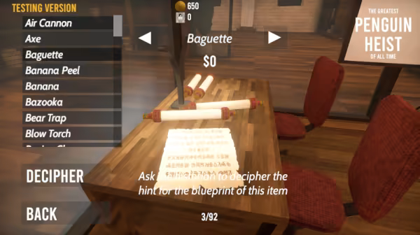 In Penguin Heist, items and weapons are unlocked by finding blueprints. These can be obtained from completing quests or by exploring. Some are easy, others are hard, and that's why one of the features of the Library is to provide hints to the player.
