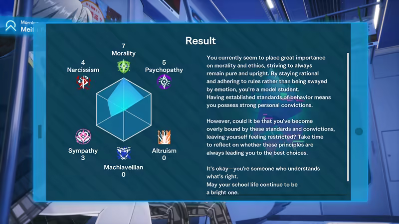 These six stats will change according to the analyses you receive and choices you make during the game.