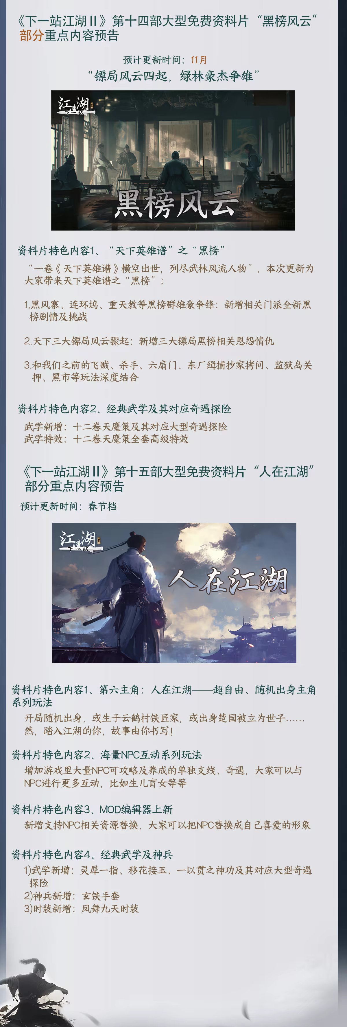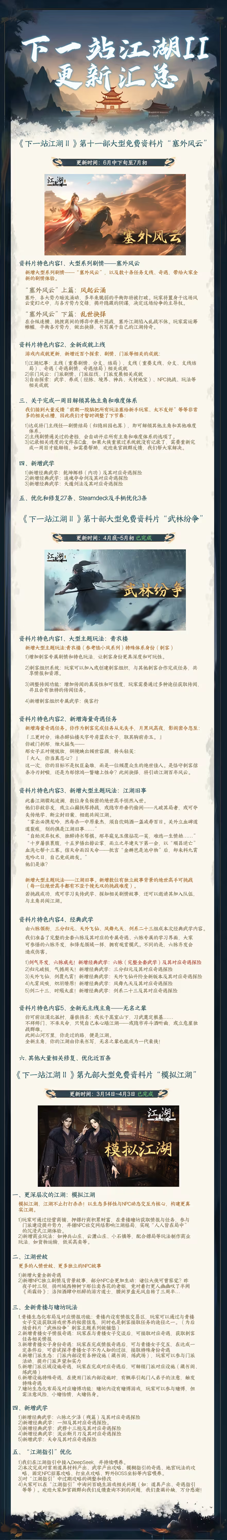 (“创新工坊”现已推出,当前已更新11个免费玩法资料片)《下一站江湖Ⅱ》是白玉京工作室研发的第二款3D单机武侠游戏,是一款包含了沙盒式的剧情主角养成、无缝大地图任意采集建造模拟经营、骑砍Like式门派霸图玩法的开放世界游戏,无内购、可离网游玩!